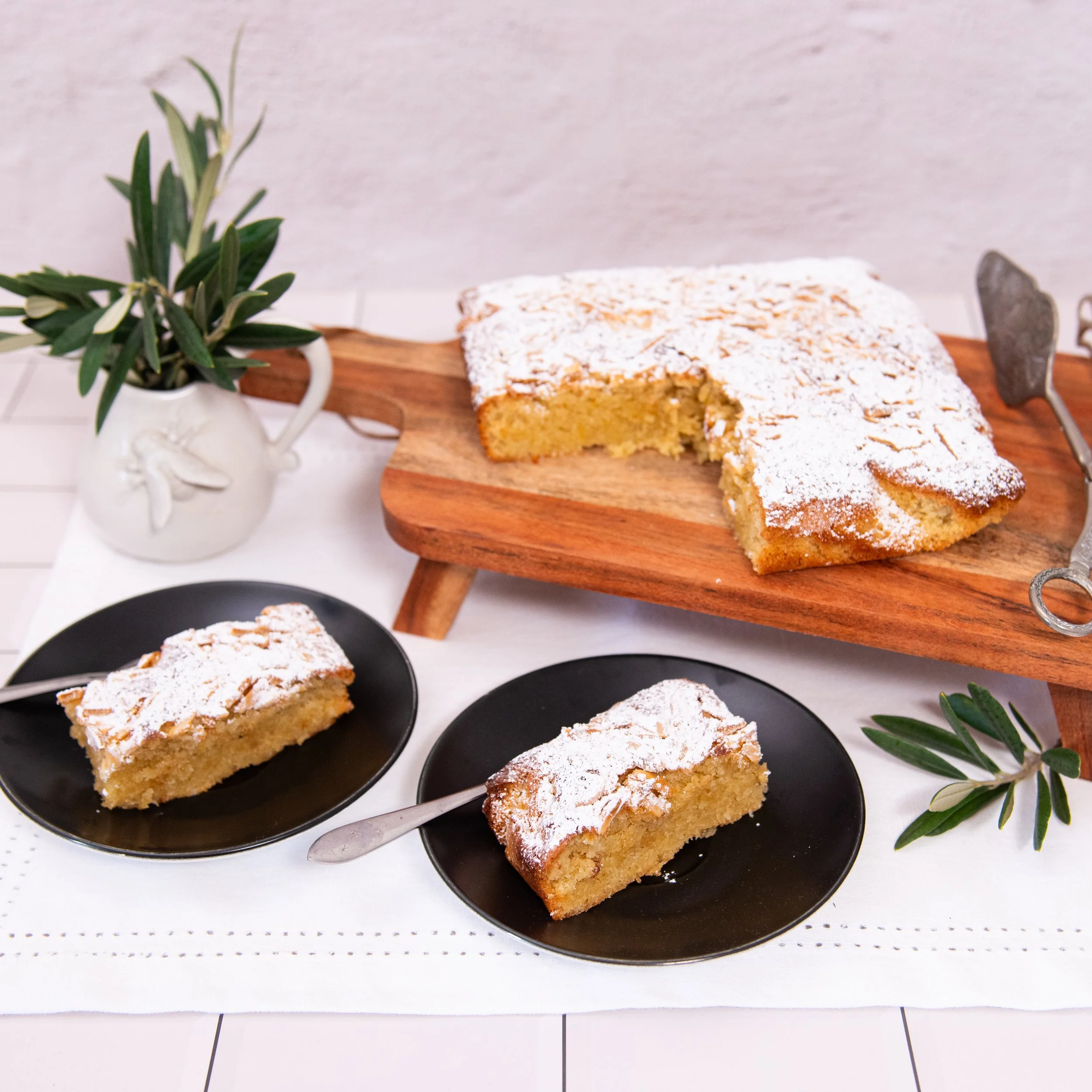 This olive oil cake is gluten free. It has a moist crumb with a crunch of almonds and coconut. Perfect on its own as a delicious afternoon tea treat or to leave covered on the counter top to slice and nibble as you want. It is simple and quick to prepare.
