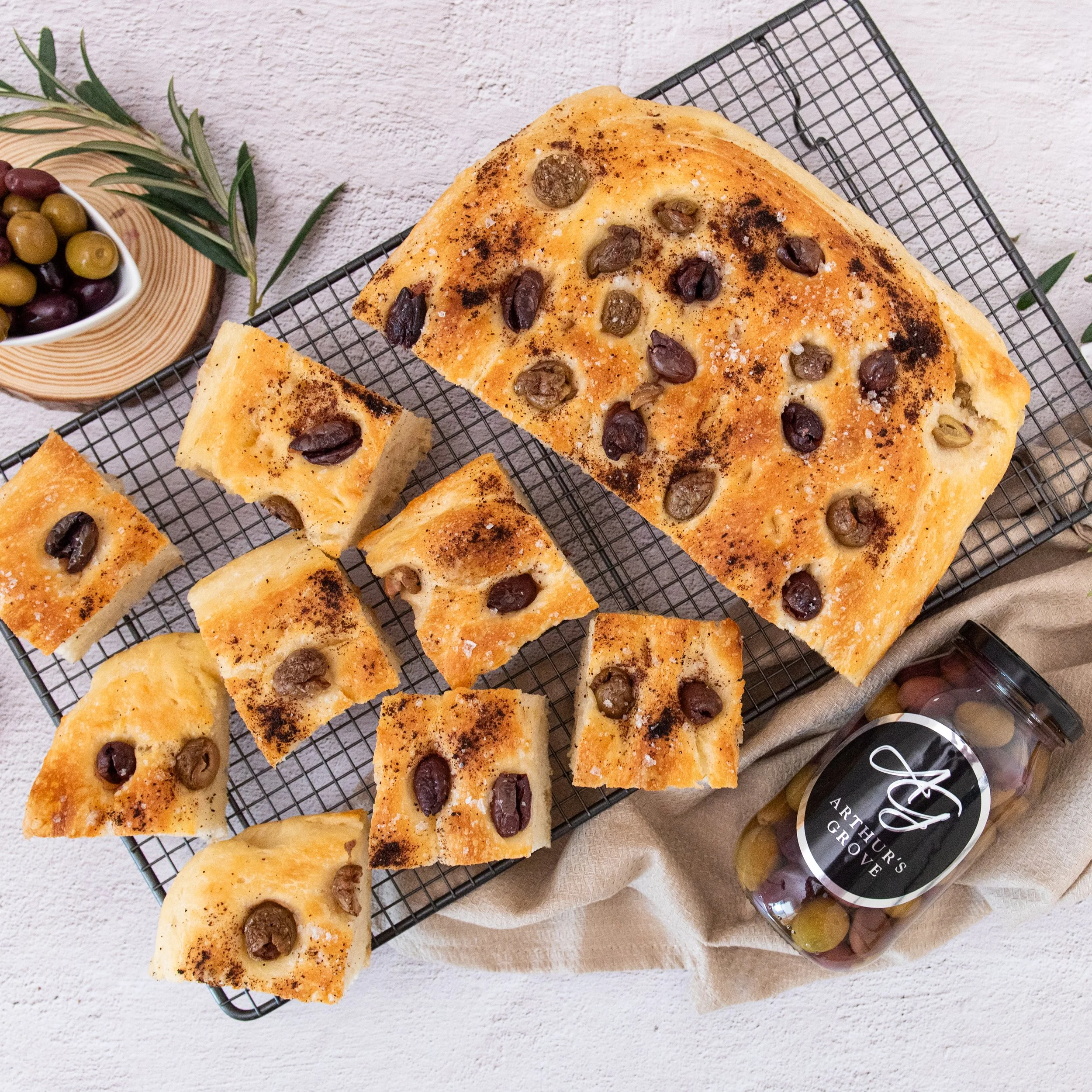 Use all of your finger tips and gently push them halfway into the top of the dough making lots of little dimples in it. Place the olives in some of the dimples. Cover the tray with a tea towel and rest the dough for the final 30 minutes while preheating the oven to 220°C.